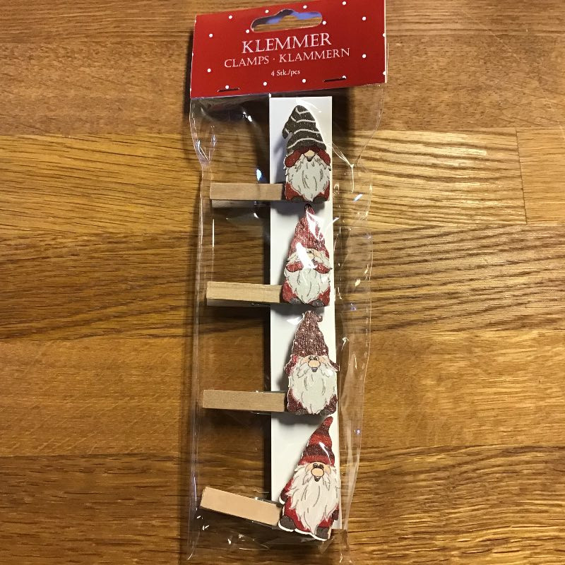 Tøjklemmer i træ med nisser - 4 stk. Mini tøjklemmer til sjov og hygge i december. Hæng børnenes jule tegninger op med de sjove tøjklemmer.