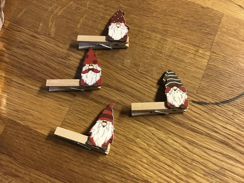 Tøjklemmer i træ med nisser - 4 stk. Mini tøjklemmer til sjov og hygge i december.