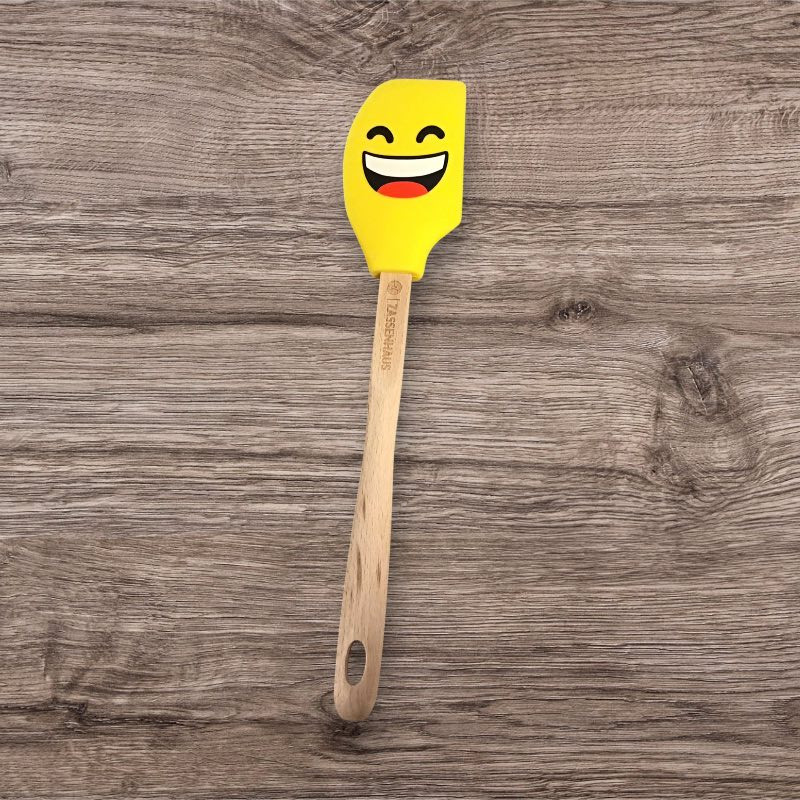 En glad dejskraber med træskaft, og gult silikone "hoved" med smiley motiv.