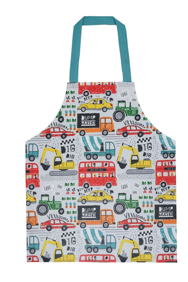 Hvem vil ikke elske, at ha' et forklæde på med biler, busser og gravemaskiner.