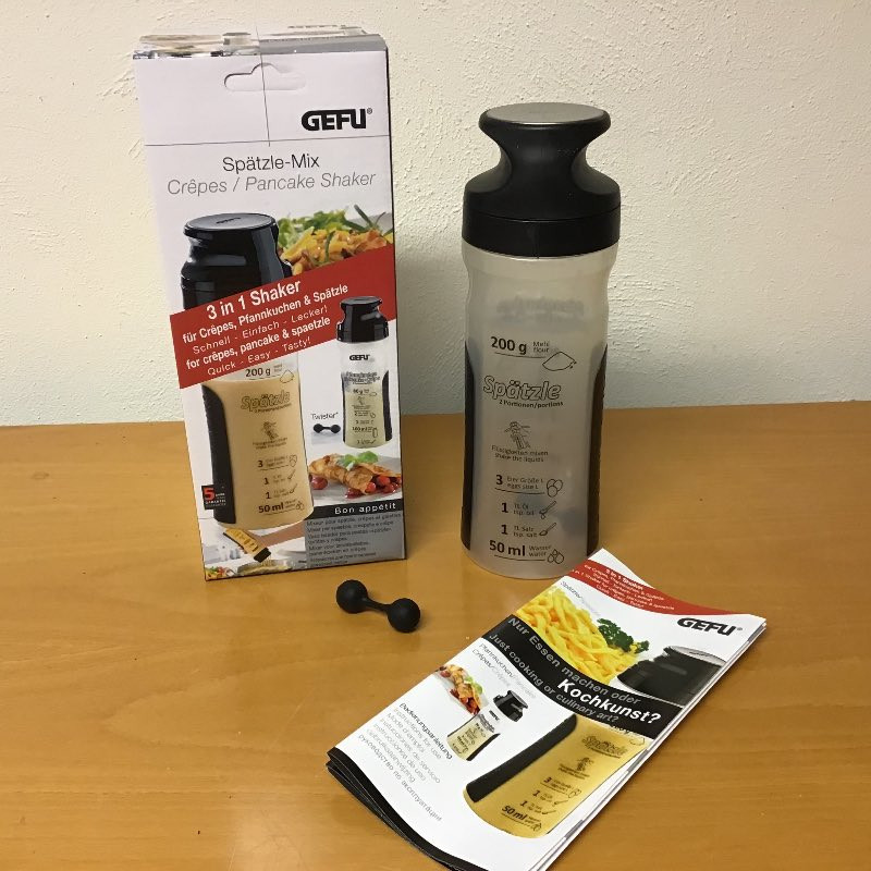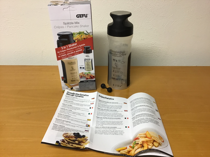 Pandekage shaker fra GEFU. Bag lækre pandekager til en hyggestund med en 3 i én shaker.