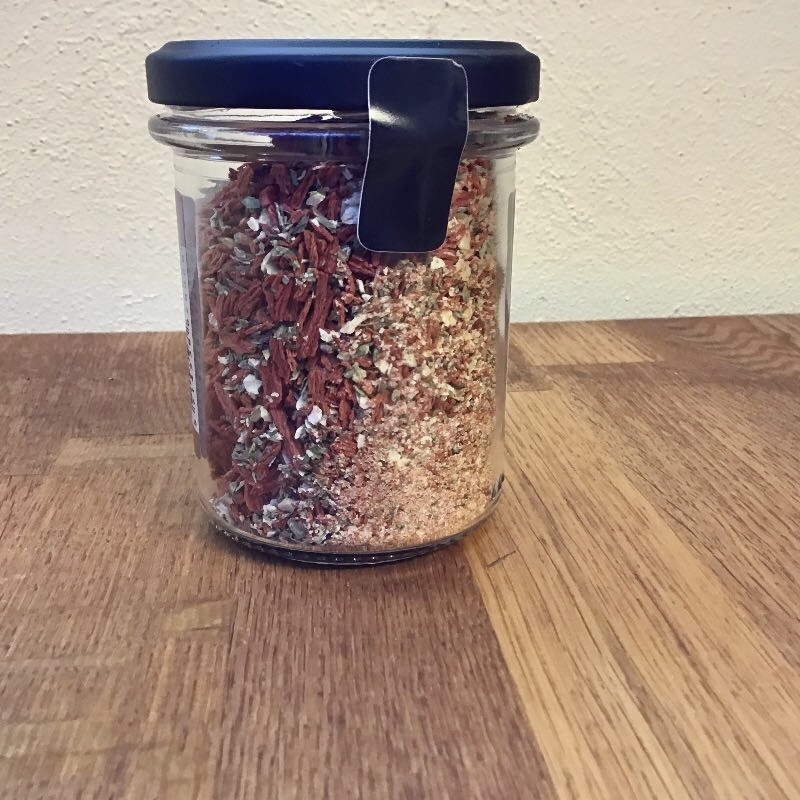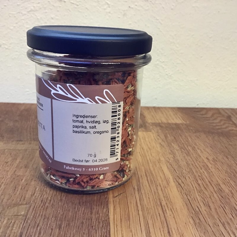 Ingredienser: tomat, paprika, purløg, rosmarin, persille, hvidløg, basilikum, oregano, chili, løg.