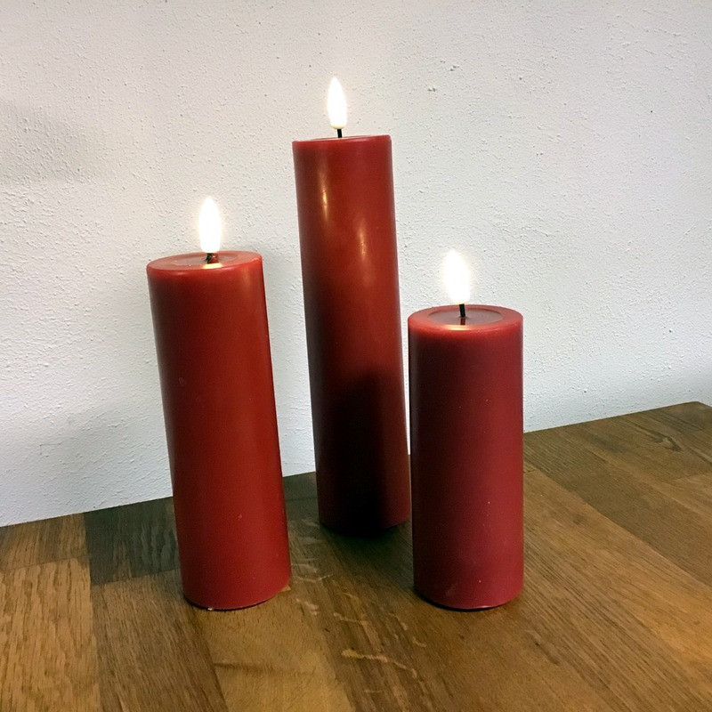 LED bloklys i rød. Måler: Ø 5 cm og 10 cm høj.