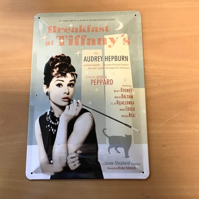 Metalskilt med motiv af Audrey Hepburn - "Breakfast at Tiffany's.